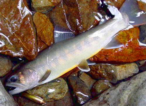 写真のイワナは当会会員のおおはし様のHPの釣行記から借りた物です。こんな素晴らしいイワナをストレートに美しいと書かれているこの釣行記を見たとき、鳥肌が立つくらい感動しました。無斑型の大和岩魚と思いますが、実に綺麗です。ここまで綺麗なイワナを見せられると『大切にしたい』と感じるのは僕だけではないはず。この写真は僕に(自然も含めて)大切にすることを再認識させてくれた一枚でした。そこでおおはし様にお願いしてお借りしました。皆様にも是非こういう素敵な魚に出会って頂きたいと思います。そして魚を通して大きな大きな自然を感じて頂きたいと思います。